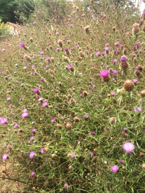 Linked with this dilemma is my current ‘invasion’ of Common Knapweed (Centaurea nigra). It has colonised a bank along the length of my driveway (photo below), and smaller areas in the Upper Garden. I know that it is an important butterfly plant, providing them with food from July to September when flowers are becoming scarcer, and that Gérard Ducerf, in his excellent volumes on Plantes Bio-indicatrices (1), is full of praise for it as an indicator of biodiversity and balanced soils, which is just what we want. But will it spread through the grasses in the Upper Garden and suffocate the wild flower populations there?