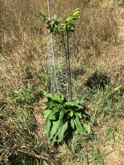 The Black Walnut (Juglans nigra) below has recovered after a shaky start including bark-stripping by deer (hence the protection), but I am not sure of the wisdom of planting the Comfrey (Symphytum officinale) quite so close in view of likely competition for water. In principle, later on, this would be fine, since they will have different root zones, but to start with I think I might move the Comfrey this winter.