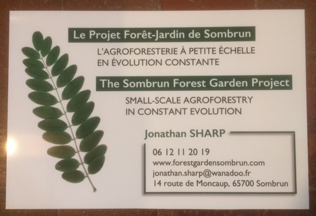 I have at last got the Sombrun Forest Garden Project sign up! It was a major job, and there was always something more important to do. I constructed the posts and cross-bars, prepared the hole at the entrance to the drive, concreted the whole thing in, sanded and stained it and finally put up the sign.