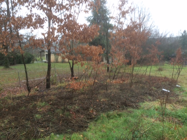 The new fruit trees were planted between the 5th and the 7th on the swale banks. These were peach Charles Roux, apple Pomme d’Albret, plum Datil and pear Tarquin des Pyrénées on the Upper Swale, and cherry Cerise Noire d’Itxassou, quince Coing de la Haie de Thouars and apple ‘GG’ (a special graft from my neighbour Gérard – you can’t get much more local than that!) on the Lower Swale. Soft fruit bushes – gooseberry, raspberry and blackcurrant – will be moved from their temporary quarters to the swales, in between the fruit trees, during the next transplanting period (February 1st and 2nd), weather permitting.