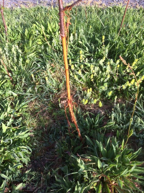 The effects of deer browsing: the Red Alder (top left) was only slightly damaged, and I was able to bind up the lower branches (top right) and put some wire netting in place (bottom left). The damage to this Wild Cherry (bottom right), however, is terminal.