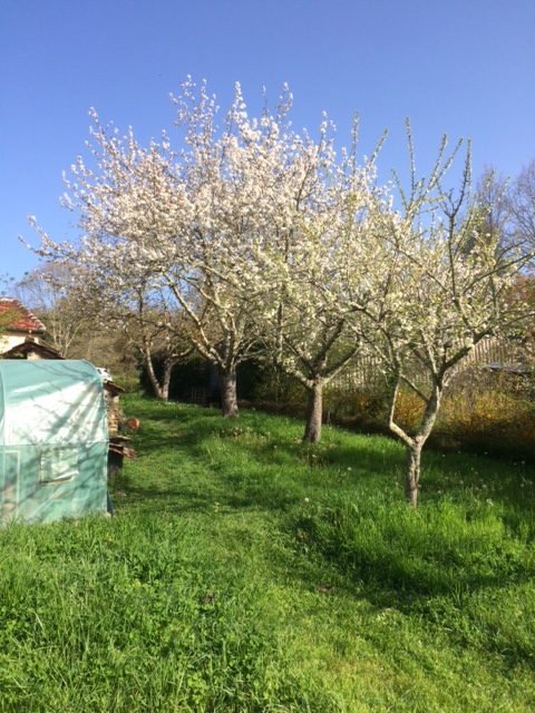 It was good to see the Mirabelle coming into abundant flower along with the cherries (photo below). The old wood on the Greengage (out of shot on the right) flowered before the one-year-old wood, which has mostly gone straight to leaf, evidence that we are not there yet with this tree! However, it is looking vigorous and there should be a reasonable amount of fruit from the old wood. Hopefully there will be a good crop from the Mirabelle, justification for the work carried out to regenerate it. You can already see the leaf replacing the flower in the photo, top right.