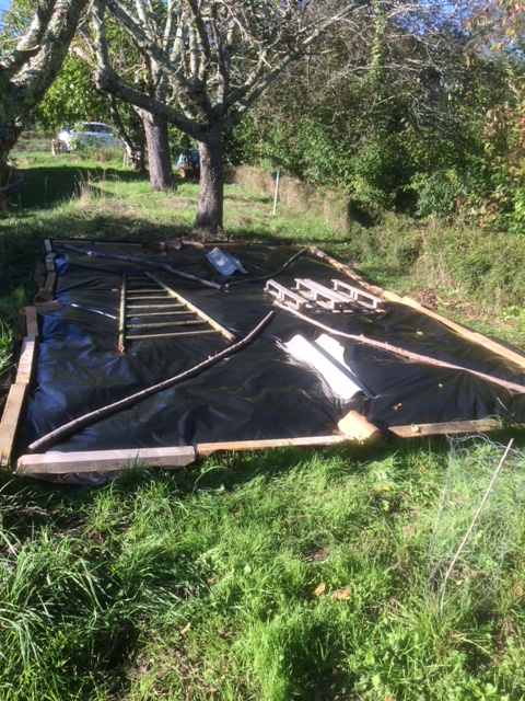 The plastic was laid this month for Carré 4 in the Lower Garden, between the cherry and mirabelle trees. This will be left until autumn 2022, when nitrogen-fixing shrubs and shade-loving perennial vegetables will be planted. One problem with the carré plastic sheets is that they come under attack from Chanua (see last month’s Blog), who rips holes in them to get at potential prey, which she must be able to hear underneath! A job for the gaffer tape (thanks Sam)!
