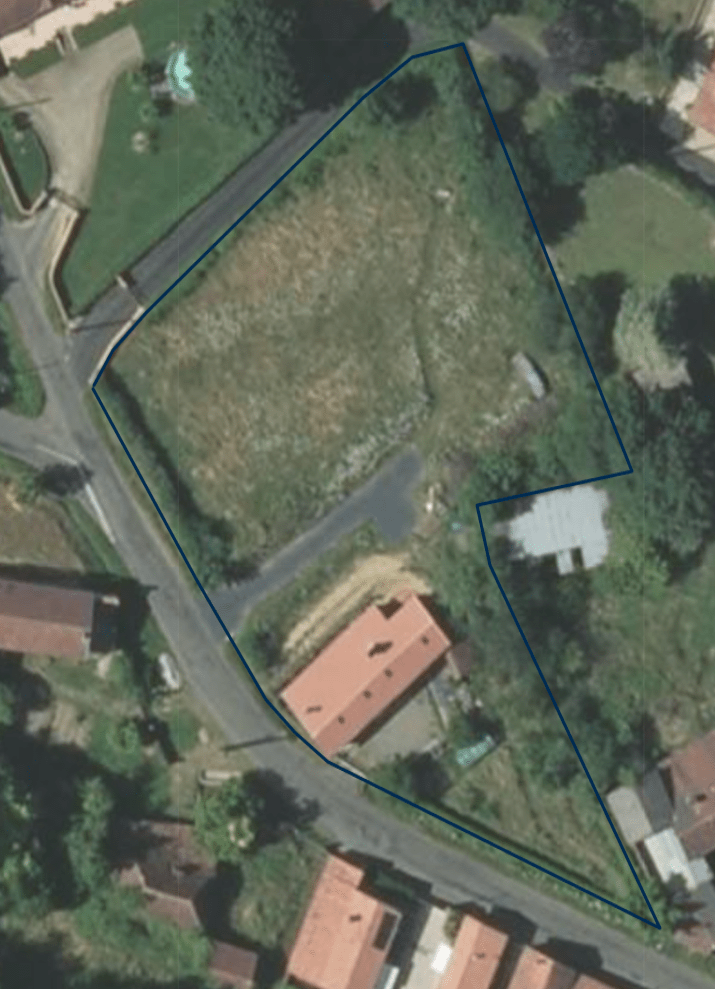 The general lie of the land in the photo above is a slope up from right to left, and the green polygon in the centre is the Project site (at 218m above sea level in the top northern corner). The forested land to the west is on a ridge, rising to 280m along the summit track to the left of the beige-coloured field (centre left).