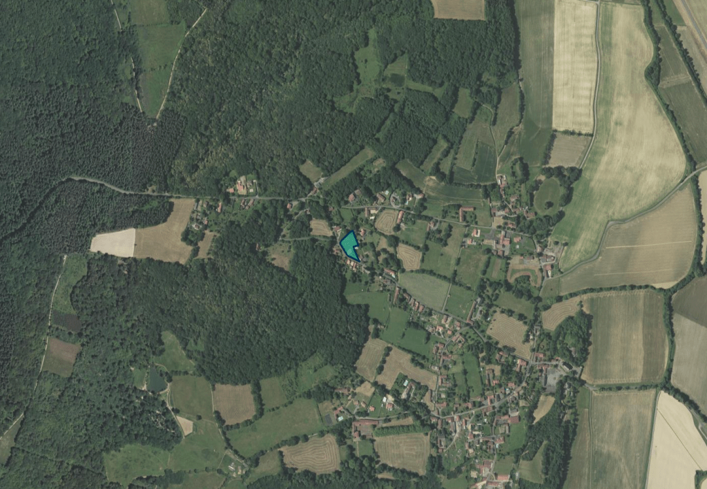 The land continues sloping down to the village centre to the south-east of the Project site, with its patchwork of livestock meadow, polyculture fields and forest, and further to the east is the flood plain of the local river (the Adour, not in this photo), with the contrast of the large industrial agriculture crop fields which characterise the valley.
