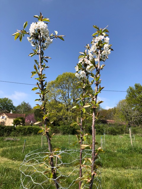 Cherry (left) and quince blossom, seemingly unaffected by the frost. These are two local varieties and they are only about 3 years old, so the amount of blossom is surprising. I love their names – Cerise Noir d’Itxassou Geresi Belxa (Basque, all x’s and consonants!) and Coing de la Haie de Thouars (the hedge in Thouars must be pretty famous by now).