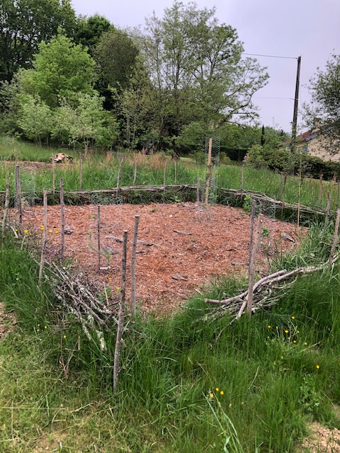 And just as a reminder of where we’re headed with these squares, here’s an up-to-date photo of Carré 1, which had the lentil treatment last year and was planted up and mulched this winter. It contains apricot, szechuan pepper, jostaberry, sea buckthorn and ground-cover raspberry, and will hopefully fill out to cover the ground and intermingle in its various layers in no time at all!