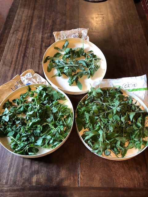 Lemon balm, sage and nettle drying for use in tisanes and cooking. A recent test revealed high iron levels in my blood, which I think can only be as a result of the amount of nettle tea I drink!