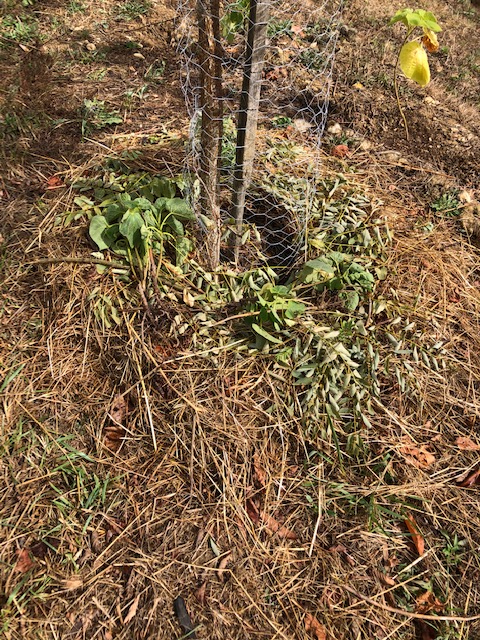 The paulownia hedge was ‘refitted’ after the summer’s drought damage, using saplings that I had retained in pots. Nearly half the original hedge had been lost, and I decided to increase the spacing of the new plants to 80cm to allow them more root room. There are now 20 plants in all, and they were planted just in time to benefit from the substantial rain we had right at the end of the month. In the photo below, the plants with paler leaves are the transplanted saplings (they were lacking nutrients in their pots) and the darker ones those that I retained. Both types had good root systems, so I hope that by transplanting this early they will have time to develop them even further before the winter cold sets in. The hedge continues right to the driveway spur in the background.