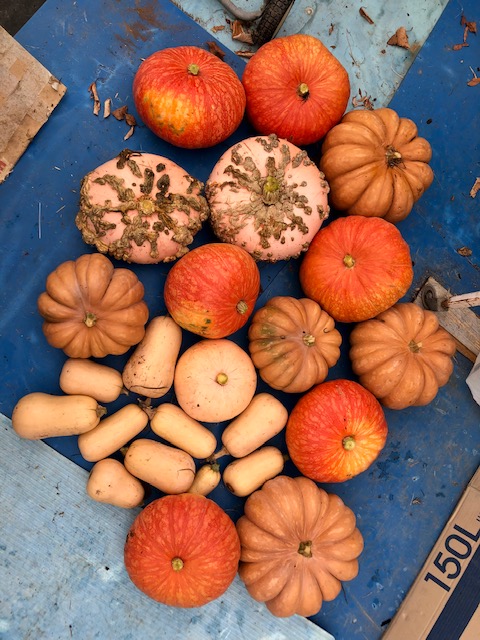 As we started to get some serious rain at the end of the month, I harvested the squash crop to bring them in to the dry, and am more than satisfied with the result. There are Courge d’Eysines (with the ‘barnacles’), butternut (foreground), and two types of pumpkin. As mentioned last month, they will easily keep me going in soups for the winter!