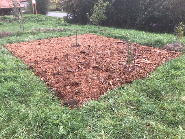 Carré 3, on the western side of the Upper Garden, also had its black plastic replaced with bark mulch, see below, and I planted two of the cider apple trees grown from seed here. All four Carrés are now in their next stage of development as productive forest garden areas, providing fertile oases from which the rest of the garden will benefit.