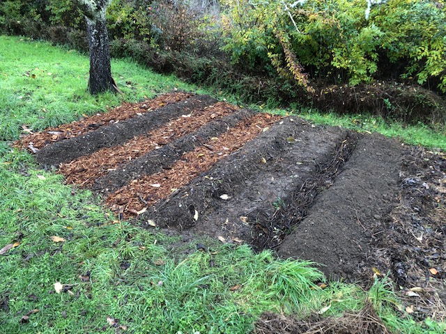 Outside in the garden, while waiting for the digger man to create the new hügelkultur beds in the Upper Garden (see the previous two months’ Blogs), I decided to create a mini version on Carré 4 in the Lower Garden (photo below). This area outside the polytunnel has been under black plastic for a year, which has already created a more workable soil, aided by the recent rains (see below). There will be five beds running across the slope, to capture the maximum amount of rainfall, and the photo shows three finished ones and a fourth with the woody biomass in the trench. Each trench has, from the bottom upwards, branches, twigs, dried grass, compost and nettles (to speed up decomposition and add minerals), all from the garden, and finally the earth replaced on top to form a mound. Straw mulch will be placed on the mounds themselves, and bark mulch is spread on the walkways between each mound.