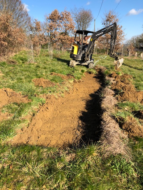 I had previously marked the contour lines with my A-frame (see the Blog, August 1st, 2021 for an explanation of this technique) and then sprayed a white line for the digger to follow; this is just visible behind the digger in the first photo above.