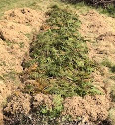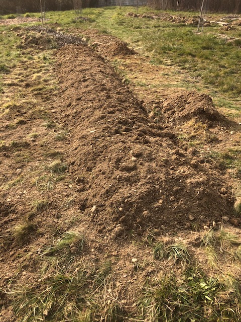 The trenches are level in both directions, both along their contour lines (hence the curved shape) and across their width, and will therefore retain moisture that either falls directly on them, or that runs down the slope into them. This is part of the fundamental logic behind the creation of these trenches – if, as seems pretty certain now, we are moving towards a hotter, drier climate, moisture retention will be vital for the survival of the Forest Garden. By placing plants and trees on and around the Hügelkultur beds, they will have a much greater chance of staying alive, particularly on my land, which, due to its stony composition, is very free-draining.