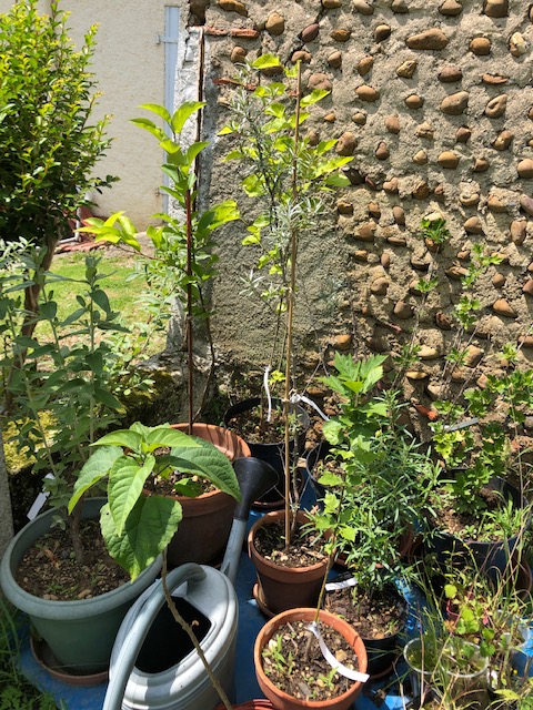 A friend gave me some lemongrass (above left), so this has been planted in the courtyard bed, with some comfrey for company. The photo above right shows my pépinière, young trees that I bought last winter and am growing on in pots this year to develop their root systems before planting out. There is a wild service tree (Sorbus torminalis), a second white mulberry (Morus alba), a Kazakhstan apple (Malus sieversii) (a wild apple that I have always been interested in, because nearly all the hundreds of apple varieties we have today came from this one species), a Russian olive (Eleagnus angustifolia), sea buckthorn (Hippophae rhamnoides) and gooseberry (Ribes uva-crispa).