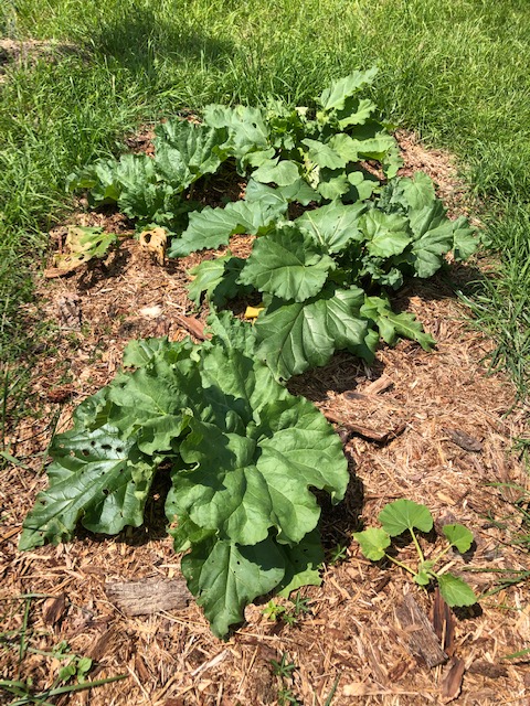 The greengages are already of a good size (above left), and I have improved the rhubarb bed (above right) with compost and bark mulch. An unidentified courge plant has also appeared, bottom right. The seed must have been in the compost.