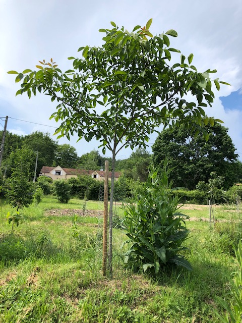 Top left, the walnut planted last year was already a good size, but it has more than doubled in volume since. The plant to the right of the walnut is a self-seeded teasel (Dipsacus spp.) which I like to have in the garden.Top right, a robinia (Black Locust) in the Coppice area is suddenly looking like a tree! Bottom, lush growth in Carré 1, showing the ground-cover raspberries, two jostaberry bushes and an apricot in the background, all planted about 18 months ago. Apart from the rain, growth here will also have been helped by the natural soil enrichment process the Carré has received over the last two or three years.