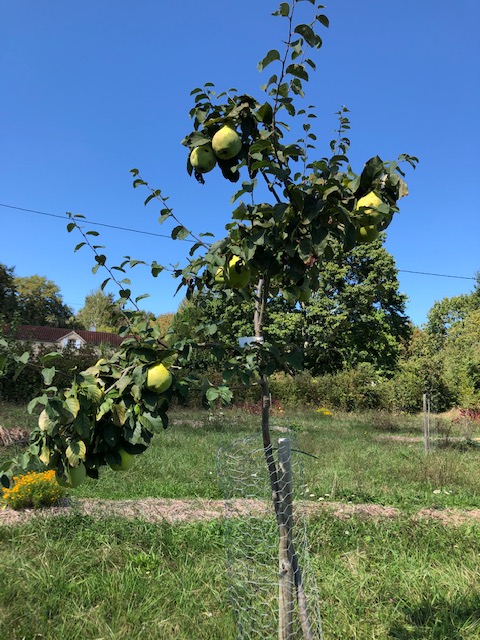 The photo above right shows the quince tree with its spectacularly large fruit, again, almost too much for the young branches. This variety has a lovely name – Coing de la Haie de Thouars – Quince from the Hedge in Thouars (a village about 100km north-east of here)! These too will be harvested soon.