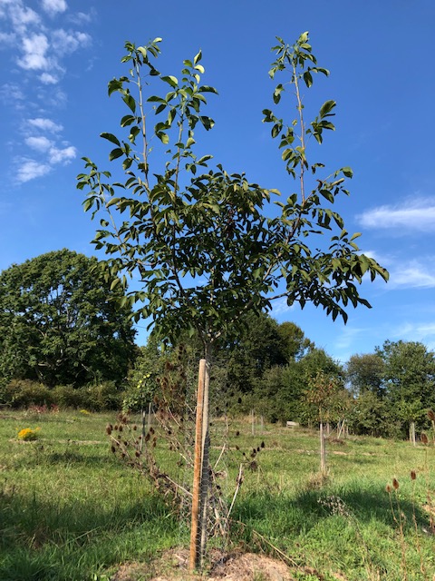 The new walnut, showing the growth it has made this year (above the main mass of foliage). It is obviously happy here, probably because it is on a bank of topsoil made when the driveway was created, and because a large amount of woody biomass was placed all along the back of the bank.
